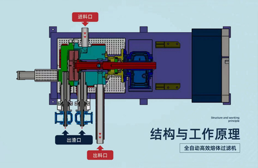 • 物料從入料口進入熔體腔,經(jīng)過濾板過濾,不同目數(shù)合格的物料從出料口流出